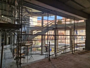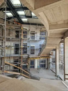 Una dintre componentele importante ale modernizării este instalarea unui nou modul termic, care va contribui la optimizarea consumului energetic al clădirii. La nivelul acoperișului, se lucrează la îmbinarea noii structuri a holului multifuncțional cu acoperișul clădirii existente, iar în interiorul acestui spațiu se realizează finisajele finale.