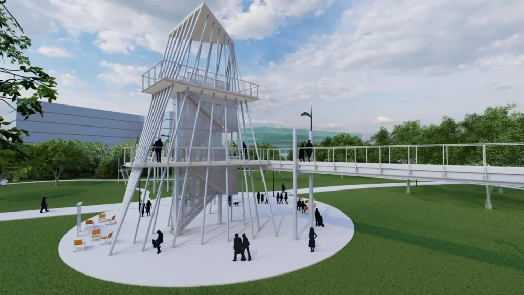 Potrivit acestora, turnul va putea fi accesat din grădina urbană și de pe pasarela suspendată, în zona unde cele două construcții se întâlnesc. Turnul va avea o scară centrală și va putea fi accesat fie pe această scară, fie de pe pasarelă, la primul nivel. Turnul va fi o construcție deschisă, cu structură metalică, având trei niveluri (P+2), și va fi acoperit.