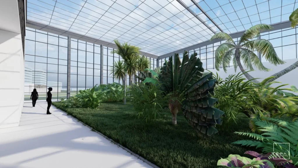 Investiția presupune construcția unei sere, a unui turn și a unei pasarele pietonale, amplasate într-un spațiu verde dinamic, unde elementele minerale, alături de conceptul de vegetație, creează un cadru propice pentru promenadă, joc și interacțiune între membrii comunității.
