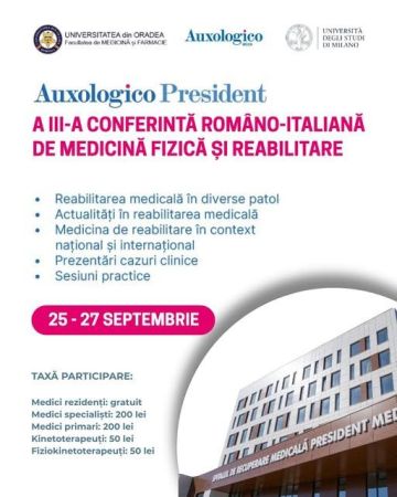 Organizată de Auxologico President – Spital de Recuperare Medicală și Istituto Auxologico Italiano, conferința se adresează medicilor specialiști, cadrelor medicale, cercetătorilor și studenților pasionați de medicina fizică și reabilitare. Evenimentul reunește experți de prestigiu din România și Italia, care vor dezbate teme actuale și vor prezenta studii de caz relevante.