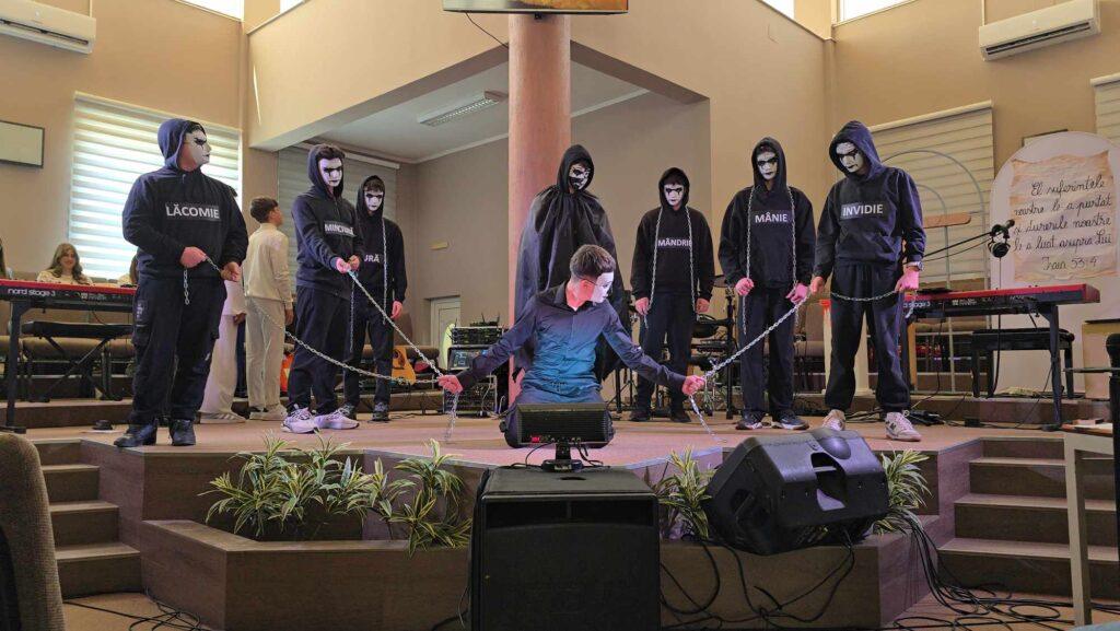 Un moment deosebit l-a reprezentat pantomima prezentată de elevii clasei a IX-a B – Lanțurile – o scenetă cu un puternic mesaj spiritual, care a adus în fața publicului simbolismul eliberării de sub povara păcatului prin jertfa lui Hristos. Inspirată din poezia lui Radu Gyr, Isus în celulă, interpretarea artistică a transmis intensitatea trăirilor interioare și chemarea la introspecție:
