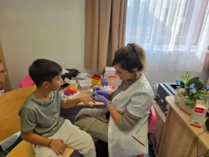 Prelevarea probelor pentru analizele medicale uzuale pentru micuţii beneficiari au fost efectuate în cadrul cabinetului medical al Centrului de Zi care este dotat corespunzător misiunii şi funcţiilor sale şi beneficiază de toate condiţiile pentru accesarea serviciilor/terapiilor disponibile la cabinetul medical.