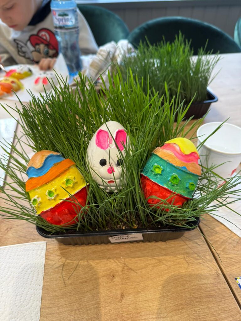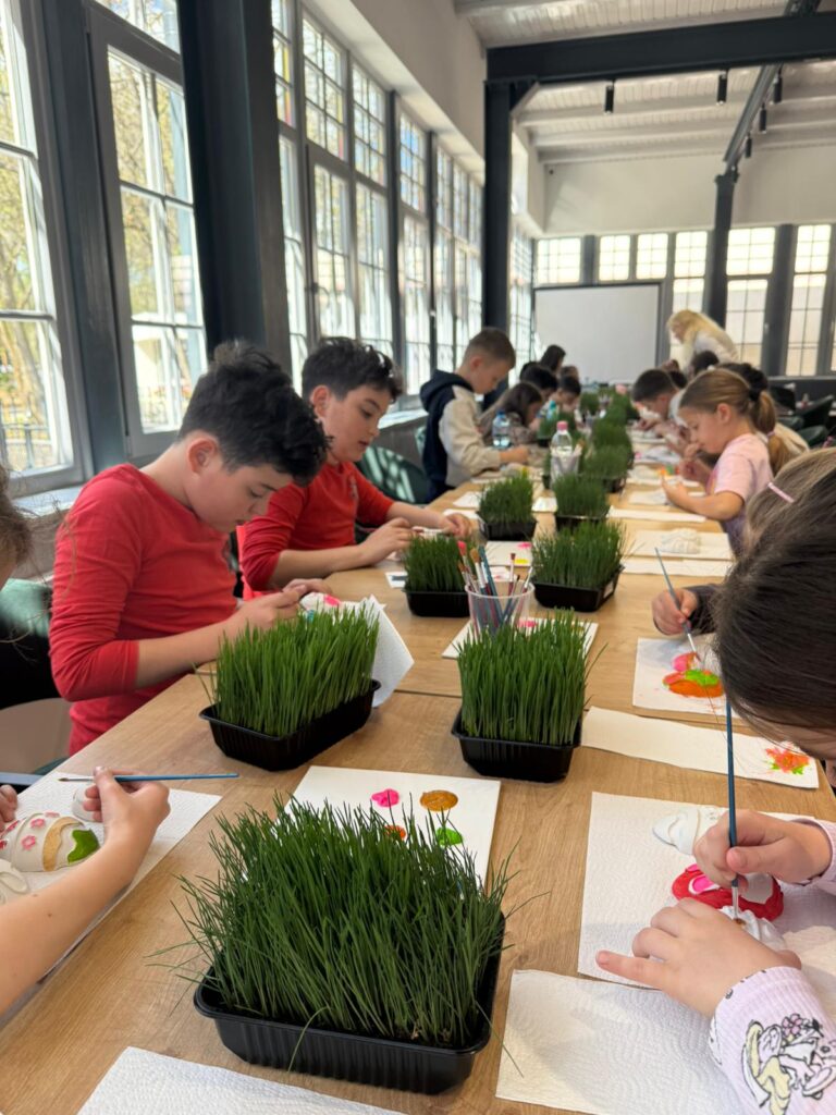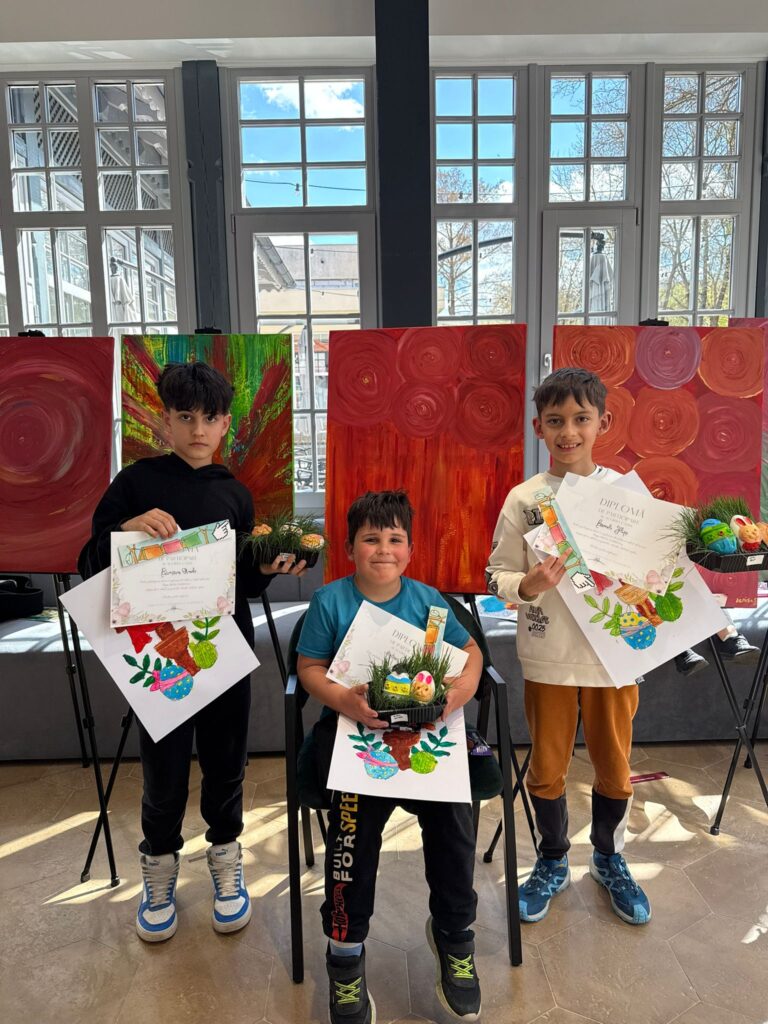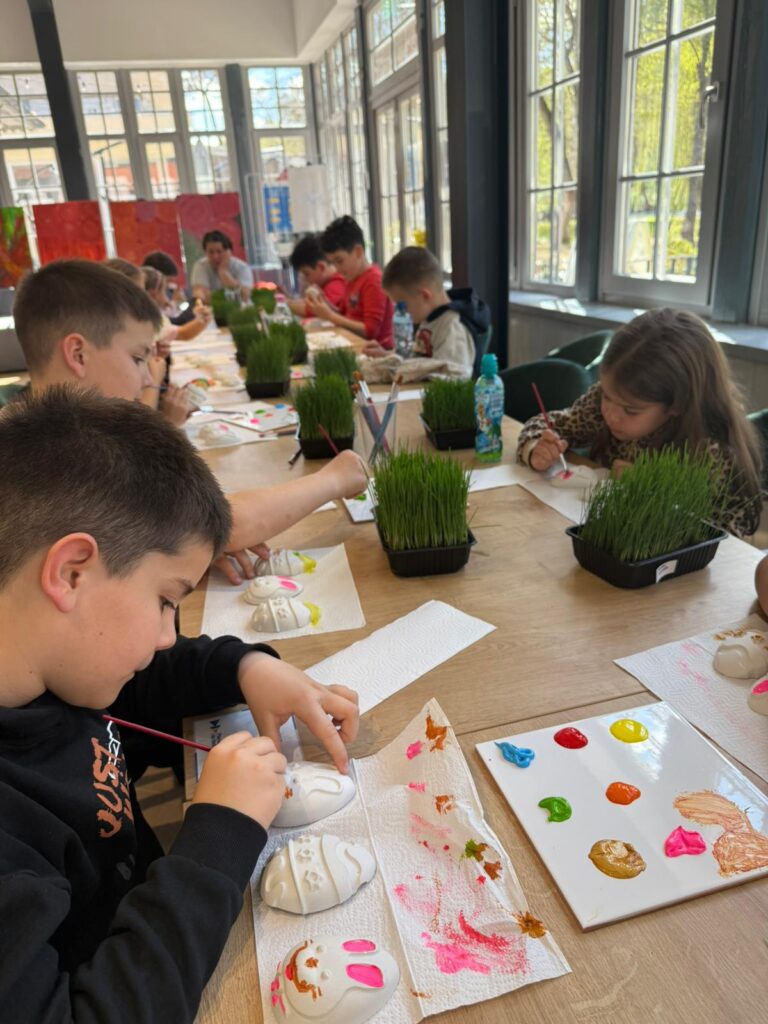 Coordonați de bibliotecara Ștefania Ardelean, copiii au participat la un atelier de pictură pe obiecte din ipsos, cu tematică de Paște. Ei au pictat ouă decorative, pe care le-au transformat în mici lucrări artistice. După finalizare, au pus ouăle în coșulețe cu grâu natural, iar rezultatul a constat în aranjamente specifice sărbătorilor pascale.