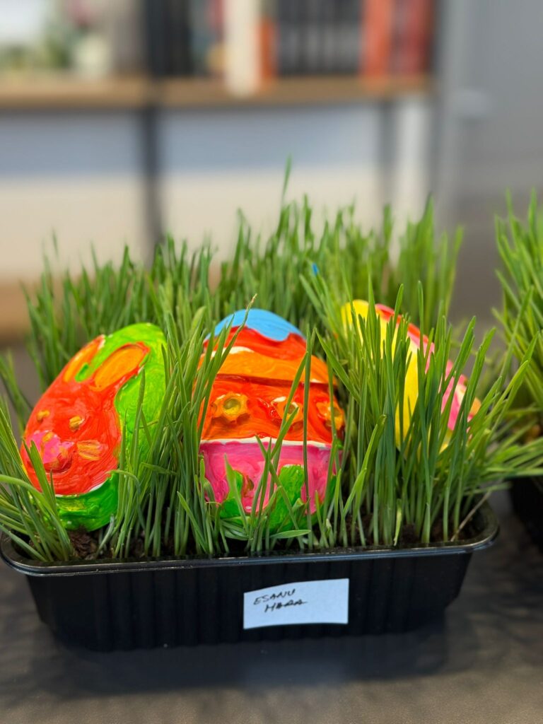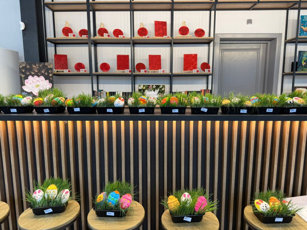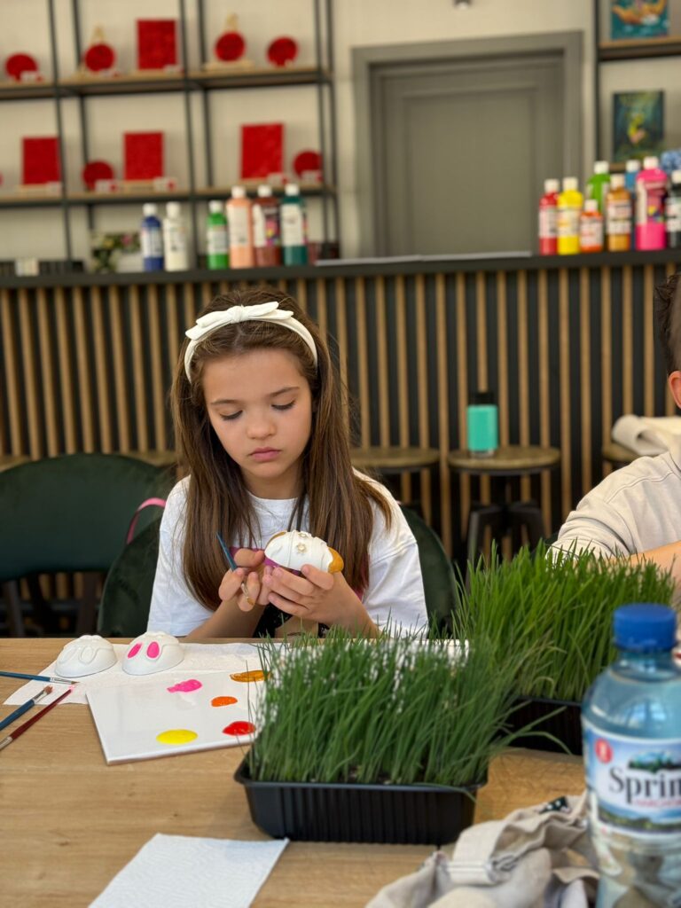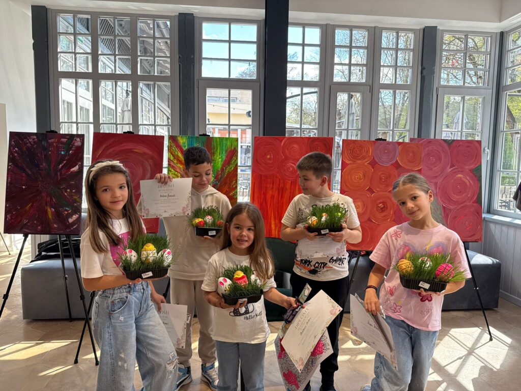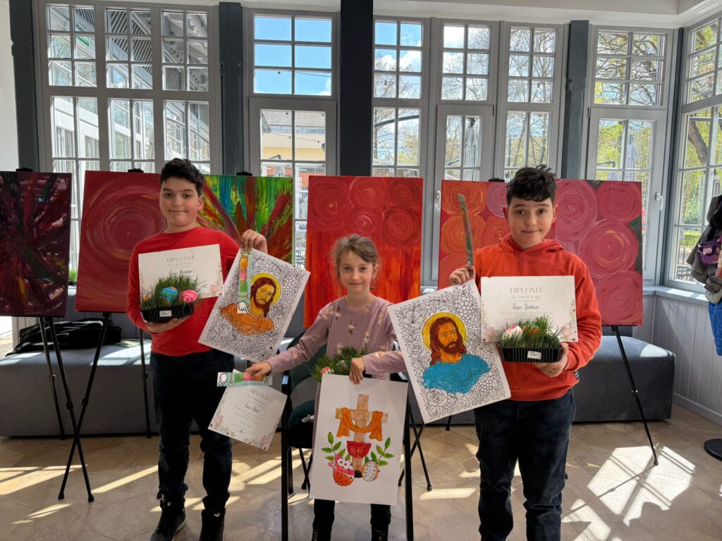 Coordonați de bibliotecara Ștefania Ardelean, copiii au participat la un atelier de pictură pe obiecte din ipsos, cu tematică de Paște. Ei au pictat ouă decorative, pe care le-au transformat în mici lucrări artistice. După finalizare, au pus ouăle în coșulețe cu grâu natural, iar rezultatul a constat în aranjamente specifice sărbătorilor pascale.