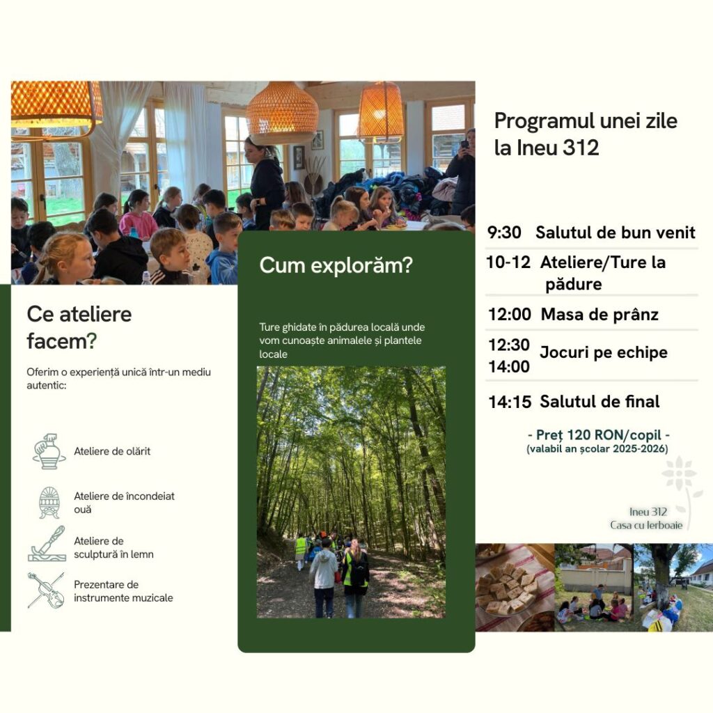 Activitățile sunt completate de ture scurte prin pădurea din apropiere, unde copiii vor putea asculta povești din folclor și vor putea descoperi flora și fauna locului. Iar la final, îi așteaptă gogoși calde și bunătăți făcute în casă, „ca la bunica în bucătărie”.