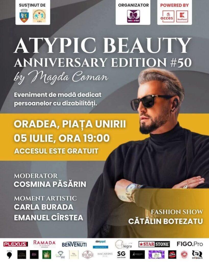 Sâmbătă, 5 iulie, începând cu ora 19:00, în Piața Unirii din Oradea va avea loc cea de-a 50-a ediție a galei Atypic Beauty. Evenimentul este organizat de Asociația Open Your Heart și este dedicat promovării incluziunii sociale a persoanelor cu dizabilități. Ediția aniversară aduce în prim-plan un concept unic în România: prezentări de modă susținute de persoane în scaun rulant, alături de modele profesioniste.