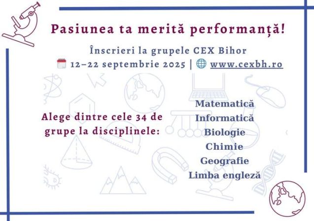 Elevii din județul Bihor pasionați de matematică, informatică, chimie, biologie, geografie sau limba engleză pot aplica pentru a face parte din grupele de excelență. Potrivit anunțului instituției, perioada de înscriere este cuprinsă între 12 și 22 septembrie 2025.