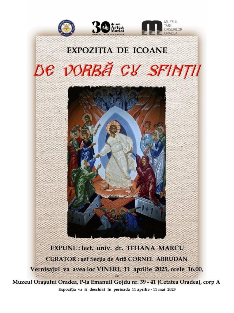 Facultatea de Arte vă invită, în data de 11 aprilie 2025, ora 16.00, la Vernisajul expoziției ,,De vorbă cu Sfinții” a artistei lect. univ. dr. Titiana Marcu. Expunerea lucrărilor, găzduită de către Muzeul Orașului Oradea – Cetatea Oradea, invită la un moment de meditație și de reflectare asupra vieții spirituale.