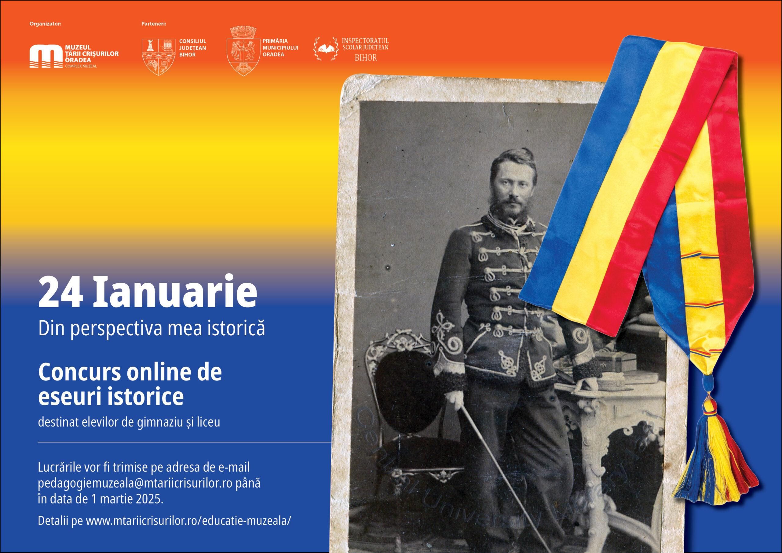 Muzeul Țării Crișurilor Oradea – Complex Muzeal, în parteneriat cu Consiliul Județean Bihor, Primăria Municipiului Oradea și Inspectoratul Școlar Județean Bihor, organizează o nouă ediție a concursului online de eseuri istorice, cu tema „24 ianuarie din perspectiva mea istorică”. Competiția este destinată tinerilor de gimnaziu și liceu.