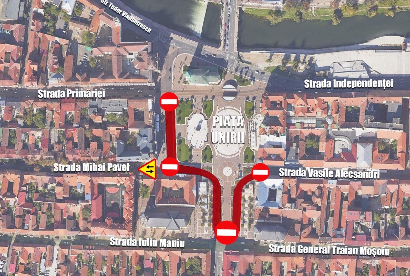 Comisia de circulație din cadrul Primăriei Oradea a avizat închiderea traficului rutier în Piața Unirii, în perioada 23 noiembrie 2024 – 2 ianuarie 2025 în vederea organizării în bune condiții a Târgului de Crăciun.