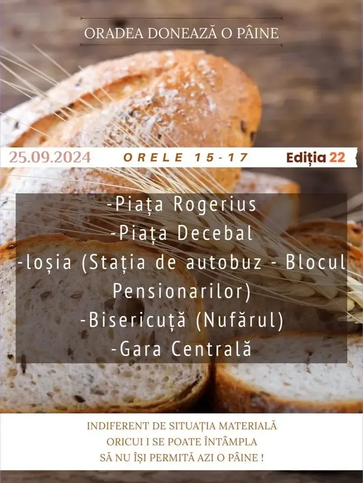 O nouă ediție a proiectului „Oradea donează o pâine” va avea loc miercuri, 25 septembrie, între orele 15:00 și 17:00. Echipa de coordonare invită comunitatea orădeană să se alăture acestei acțiuni de solidaritate.