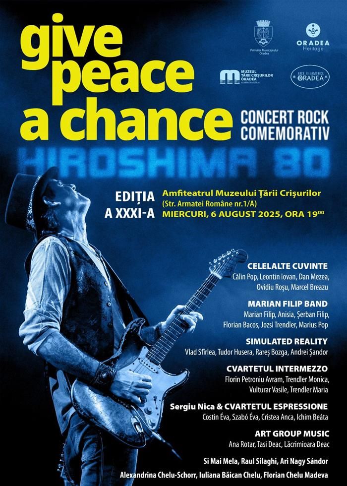 Seara de 6 august a adus din nou în prim-plan mesajul păcii, prin concertul comemorativ Give Peace a Chance, desfășurat tradițional în parcul Muzeului Țării Crișurilor. Evenimentul, ajuns la a 31-a ediție, a reunit sute de orădeni și iubitori ai muzicii, într-un moment de reculegere și reflecție la 80 de ani de la bombardamentul atomic de la Hiroshima.