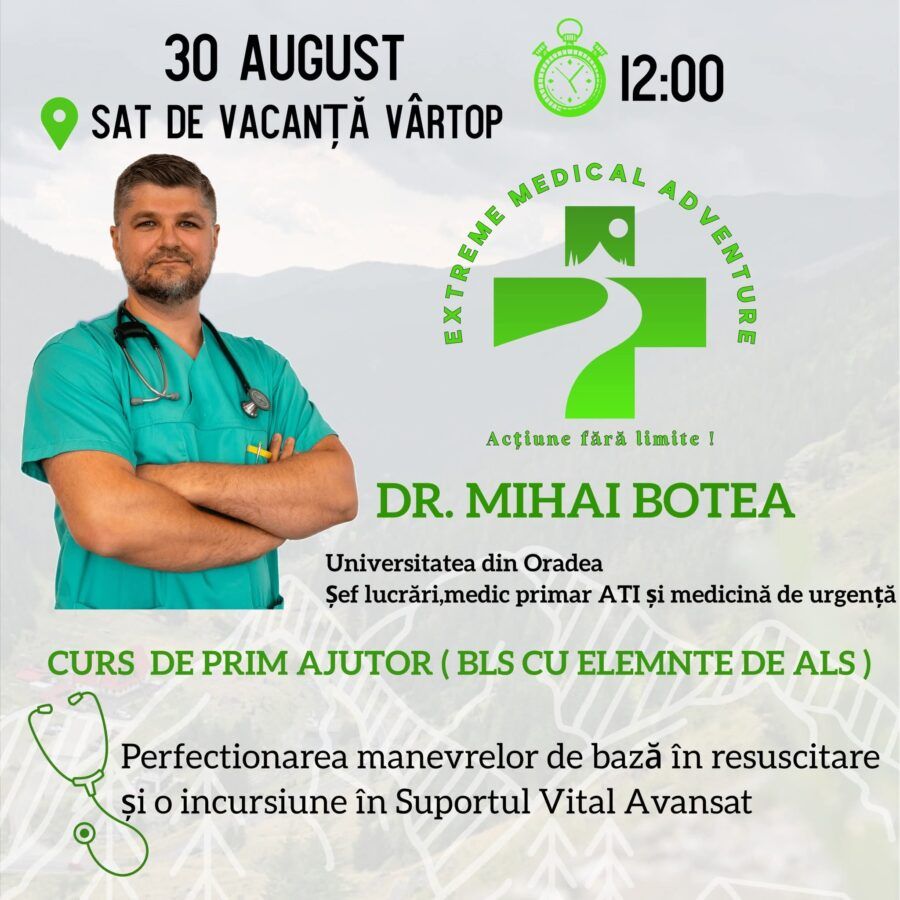 Serviciul Județean de Ambulanță Bihor organizează, în cadrul evenimentului Extreme Medical Adventure (E.M.A.), un curs interactiv și intensiv de prim ajutor, destinat perfecționării cunoștințelor și abilităților esențiale pentru intervenția în situații critice. Participanții vor avea ocazia să învețe direct de la specialiști cum să acționeze eficient în momente care pot face diferența între viață și moarte.