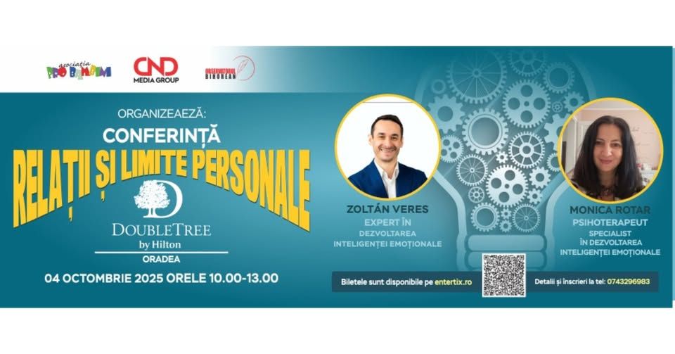Asociația Pro Bambini Oradea, în parteneriat cu CND Media Group, organizează conferința „Relații și limite personale”. Evenimentul va avea loc pe 4 octombrie 2025, între orele 10:00 și 13:00, la Hotel Double Tree by Hilton, și se adresează tuturor celor care vor să înțeleagă mai bine cum să construiască relații sănătoase și cum să-și stabilească limite personale clare.