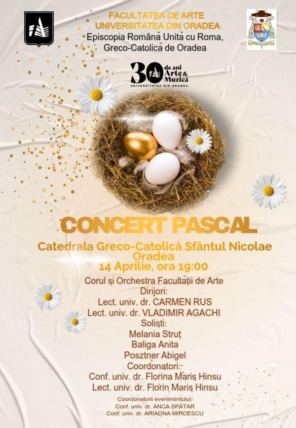 Departamentul de Muzică al Facultății de Arte a Universității din Oradea invită publicul meloman la un concert extraordinar dedicat Sărbătorilor Pascale. Evenimentul va avea loc luni, 14 aprilie 2025, de la ora 19:00, la Catedrala Greco-Catolică „Sf. Nicolae” din Oradea, iar intrarea este gratuită, în limita locurilor disponibile.
