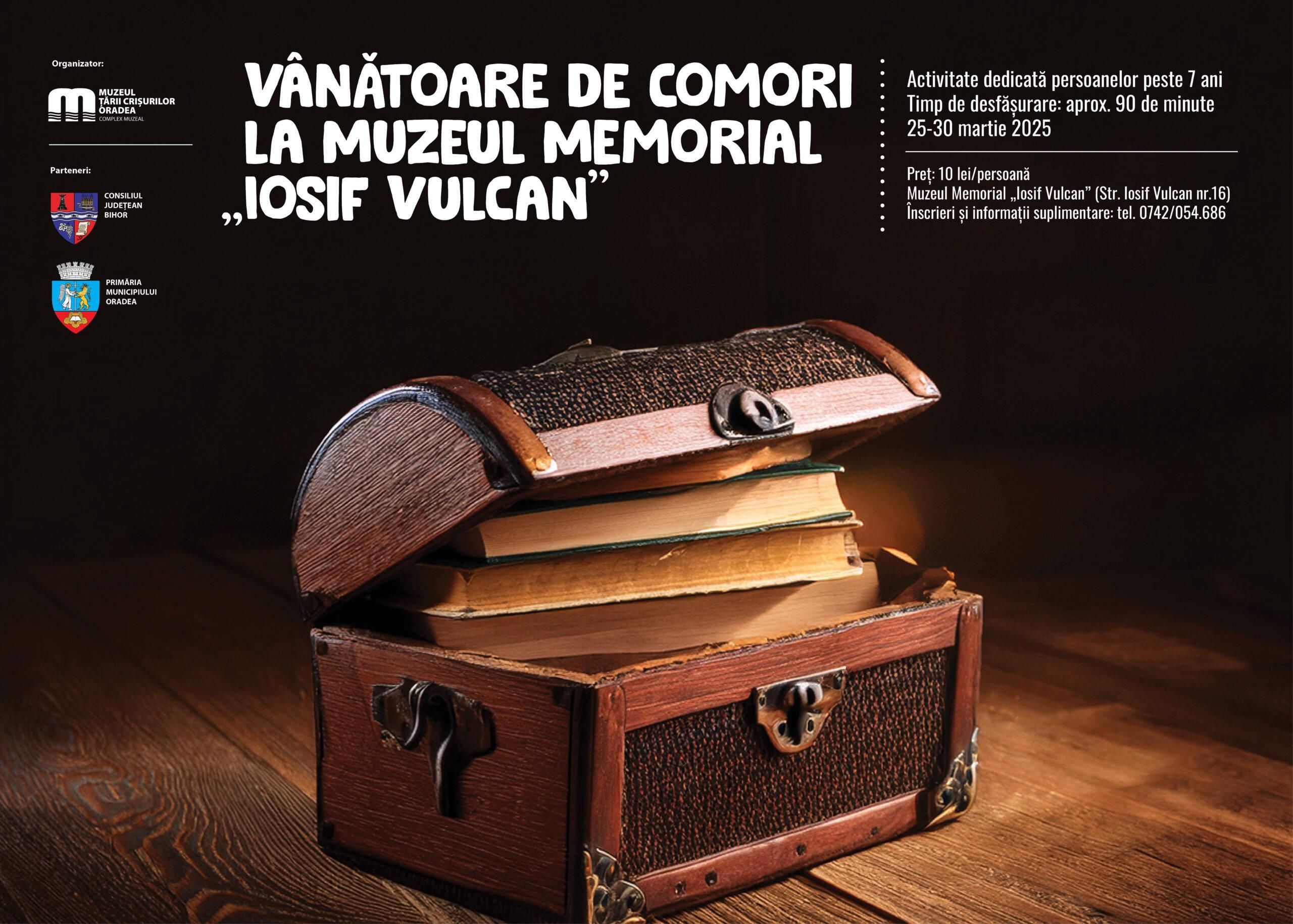 Muzeul Țării Crișurilor Oradea – Complex Muzeal, în parteneriat cu Consiliul Județean Bihor și Primăria Municipiului Oradea, organizează activitatea Vânătoare de comori la Muzeul Memorial „Iosif Vulcan”.