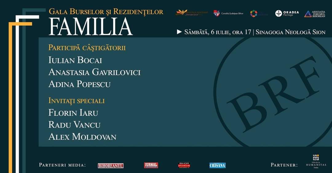 Revista de cultură ,,Familia”, împreună cu Biblioteca Județeană „Gheorghe Șincai” Oradea, Consiliul Județean Bihor, Visit Oradea, Oradea Heritage și Asociația Forumul Bihorean organizează Gala Burselor și Rezidențelor ,,Familia”