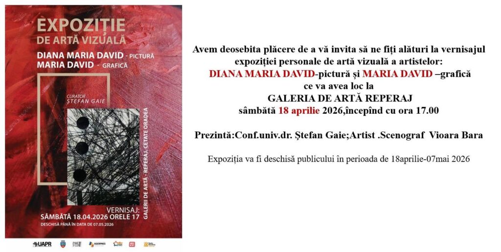 Iubitorii de artă din Oradea (și nu numai) sunt invitat la o expoziție de artă vizuală care aduce în prim-plan lucrări semnate de Diana Maria David și Maria David. Evenimentul va avea loc la Galeriile de Artă „Reperaj” din Cetatea Oradea, iar vernisajul este programat sâmbătă, 18 aprilie 2026, de la ora 17:00. Expoziția va putea fi vizitată până în 7 mai 2026.