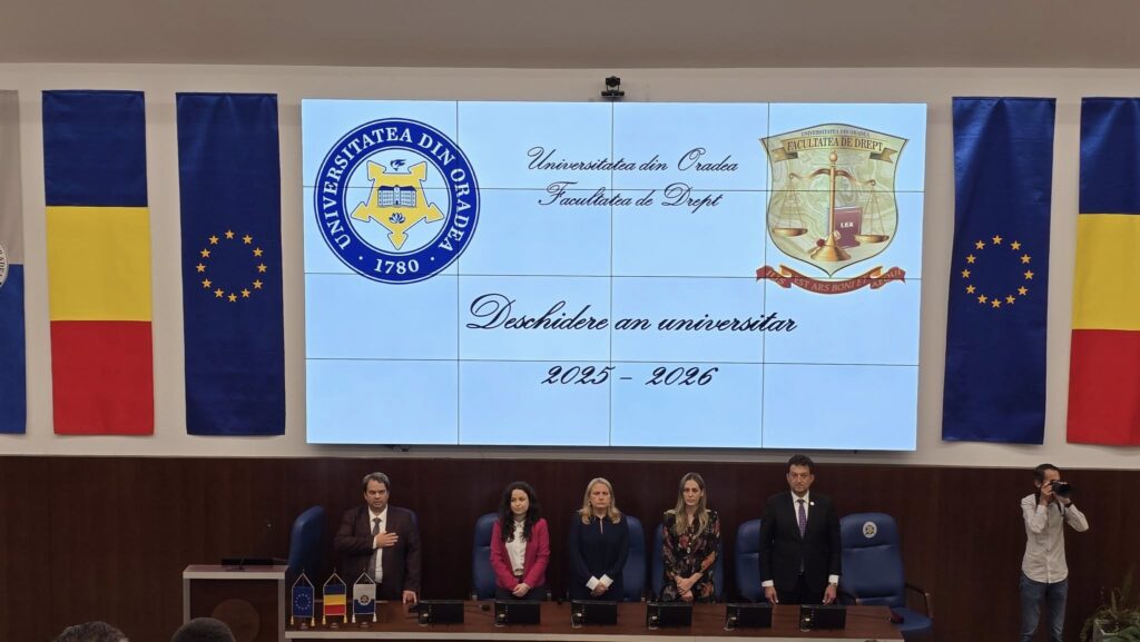 Facultatea de Drept a Universității din Oradea și-a deschis oficial, marți, porțile pentru studenții de la specializările Drept și Administrație publică. Evenimentul a avut loc în Aula Magna, plină până la refuz, cu toate locurile ocupate.