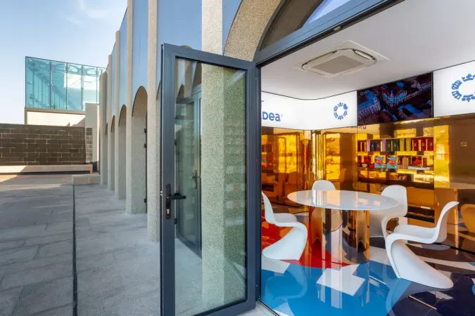 Acest proiect nu își propune să fie doar un simplu punct de informare, ci și o experiență vizuală și senzorială unică, inspirată din arhitectura orașului și transpusă într-un limbaj contemporan, aflat la granița dintre instalație artistică și spațiu funcțional. Designul interior este unul cel puțin spectaculos. Pereții sunt placați cu cupru și reușesc să transforme lumina și peisajul urban într-un dialog permanent cu exteriorul, iar pardoseala colorată în nuanțele identitare ale brandului Visit Oradea aduce energie și dinamism. Mobilierul alb, cu forme fluide, completează atmosfera, oferind repaus vizual într-un cadru vibrant și modern.