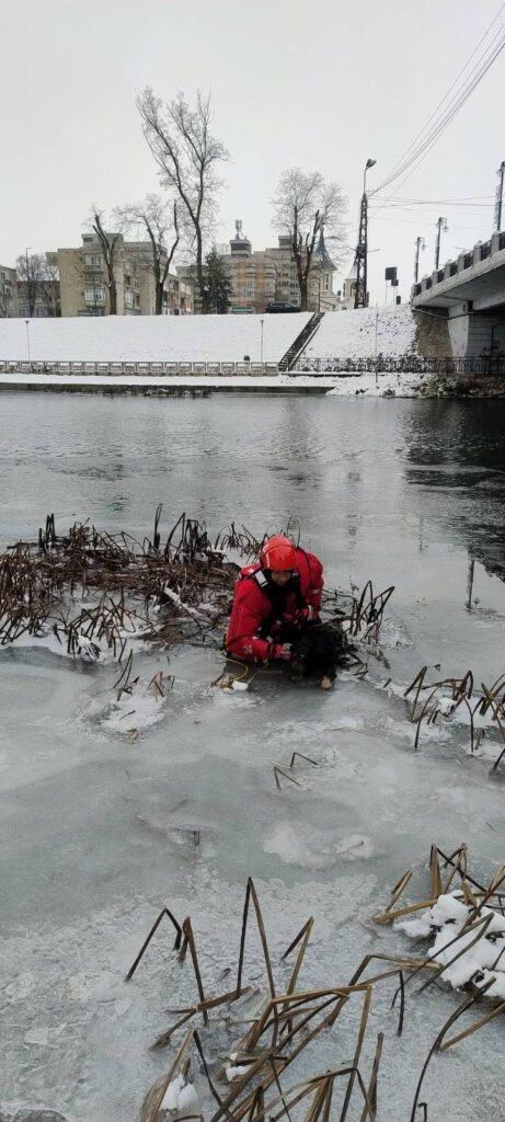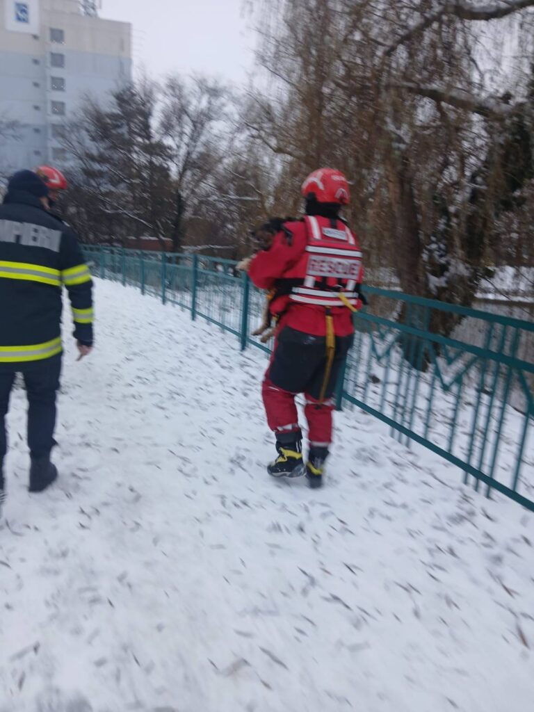 La fața locului au ajuns rapid pompierii Detașamentului 1 Oradea. Echipați corespunzător și folosind tehnici specifice acestui tip de intervenții, salvatorii s-au deplasat pe suprafața gheții până la locul incidentului, au scos câinele din apă și l-au adus în siguranță la mal.