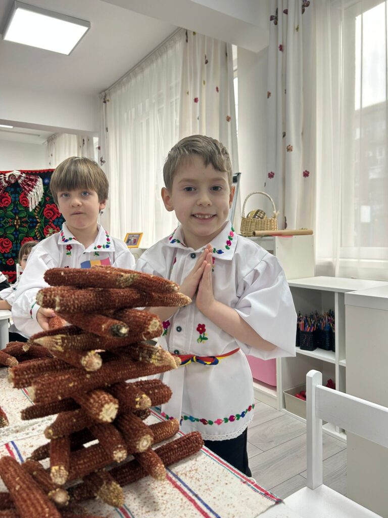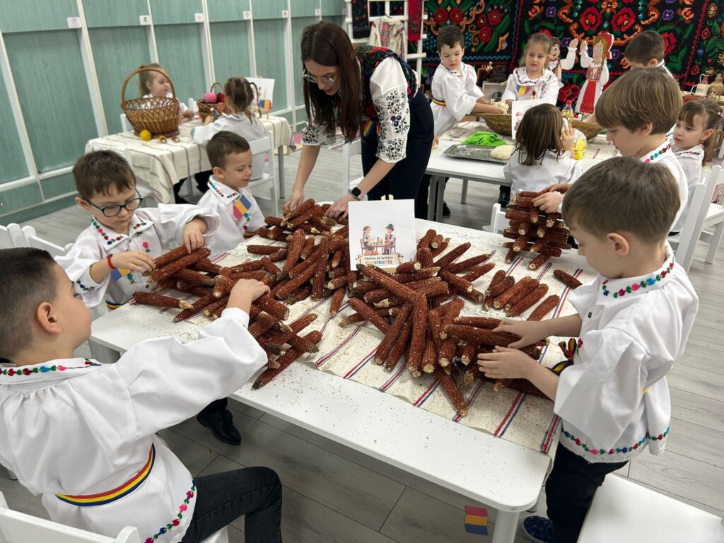 De asemenea, au desprins boabele de porumb de pe știulete și au confecționat bobine din știuleți de porumb, așa cum se făcea în trecut. Practic, băieții au construit diferite forme din știuleți, iar fetele au înfășurat fire de ață pe un suport, tot din știulete, astfel încât să nu se desfacă și să nu se încurce. Activitățile au continuat cu colorat, pictat și joc.
