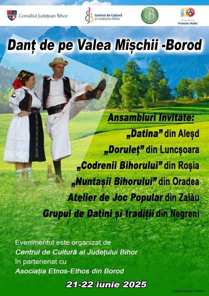Centrul de Cultură al Județului Bihor și Asociația Culturală Etnos-Ethos din Borod, în parteneriat cu Arhiva Națională de Folclor – Filiala Cluj și Televiziunea Română, organizează duminică, 22 iunie, începând cu ora 14:00, un eveniment cu totul special. Este vorba de „Danț pe Valea Mîschi”, o manifestarea care va aduce în prim-plan una dintre cele mai vii expresii ale patrimoniului imaterial bihorean – danțul tradițional de duminică.
