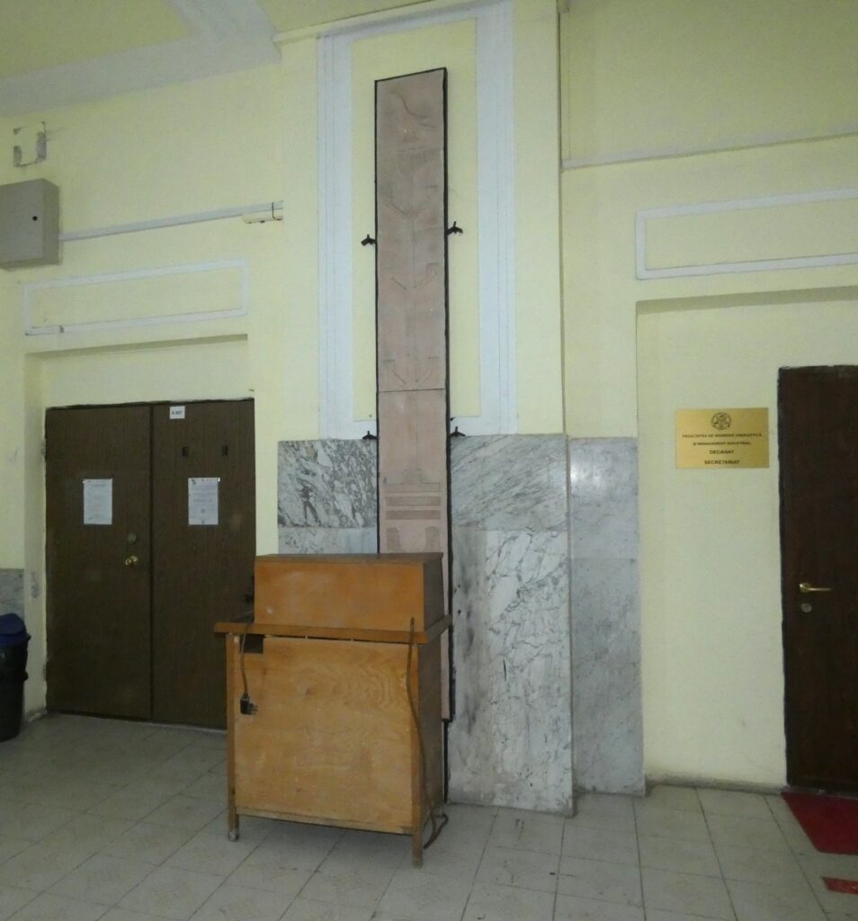 Aproape uitate, cele două piese ceramice se găsesc în holul corpului A din campusul central.