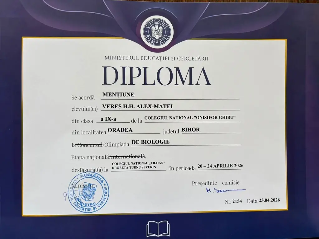 Rezultat foarte bun pentru un elev din Oradea. Alex Matei Vereș, elev în clasa a IX-a C la Colegiul Național ,,Onisifor Ghibu”, s-a întors cu un premiu important de la etapa națională a Olimpiadei de Biologie.