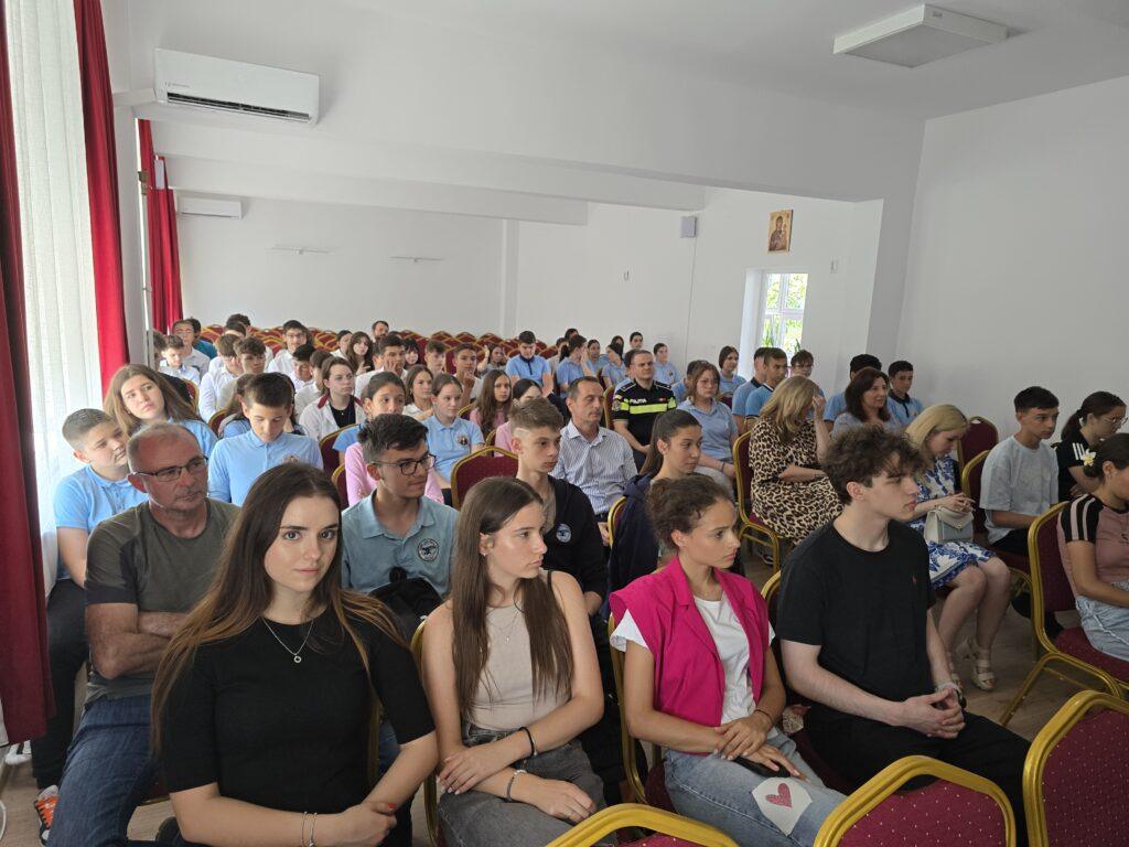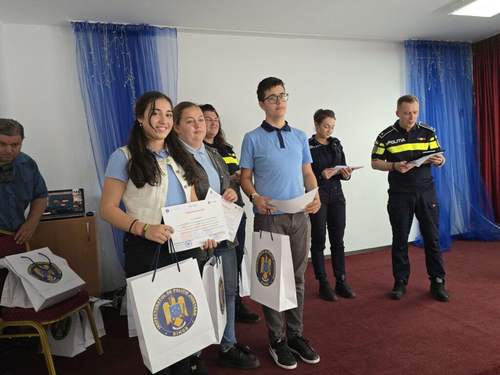 Miercuri, 4 iunie 2025, în sala de festivități a Liceului Ortodox „Episcop Roman Ciorogariu” Oradea polițiștii: subcomisar Ardelean Adrian, subcomisar Goia Eugen, comisar-șef Merce Delia și agent-șef Mălan Cristina din cadrul Biroului Siguranță Școlară, condus de subcomisar de poliție Adina Gherman, împreună cu inspectorul școlar prof. Florin Negruțiu, au premiat elevii și profesorii coordonatori din unitățile de învățământ participante la Concursul Național de Creație Virtuală “Vocea Ta e Soluția!” – etapa județeană.