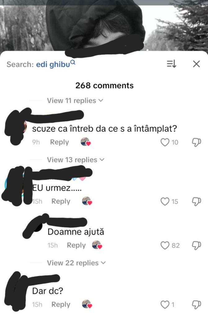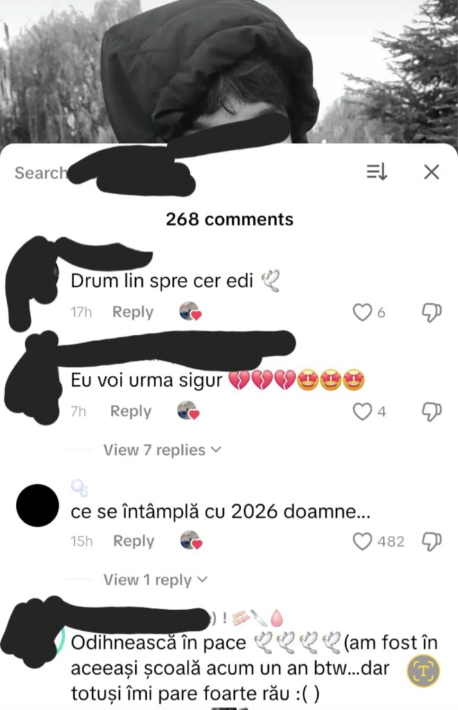 Unii utilizatori au scris scurt că „vor urma”, alții lasă de înțeles că se gândesc serios să își pună capăt vieții sau au sugerat că tragedia din Oradea nu ar fi un caz izolat, ci parte dintr-un fenomen mai larg care afectează adolescenții. Mesajele au fost lăsate de conturi care par să aparțină unor tineri.