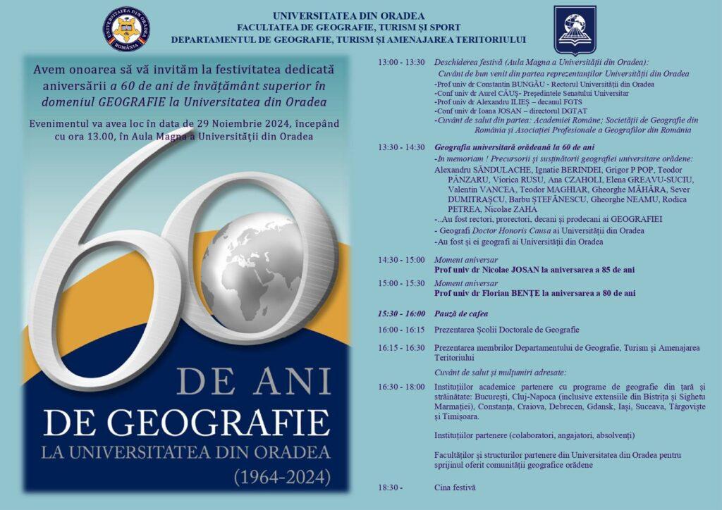 Facultatea de Geografie, Turism și Sport, prin Departamentul de Geografie, Turism și Amenajarea Teritoriului, organizează, pe 29 noiembrie 2024, o manifestare dedicată aniversării a 60 de ani de învăţământ geografic universitar orădean.