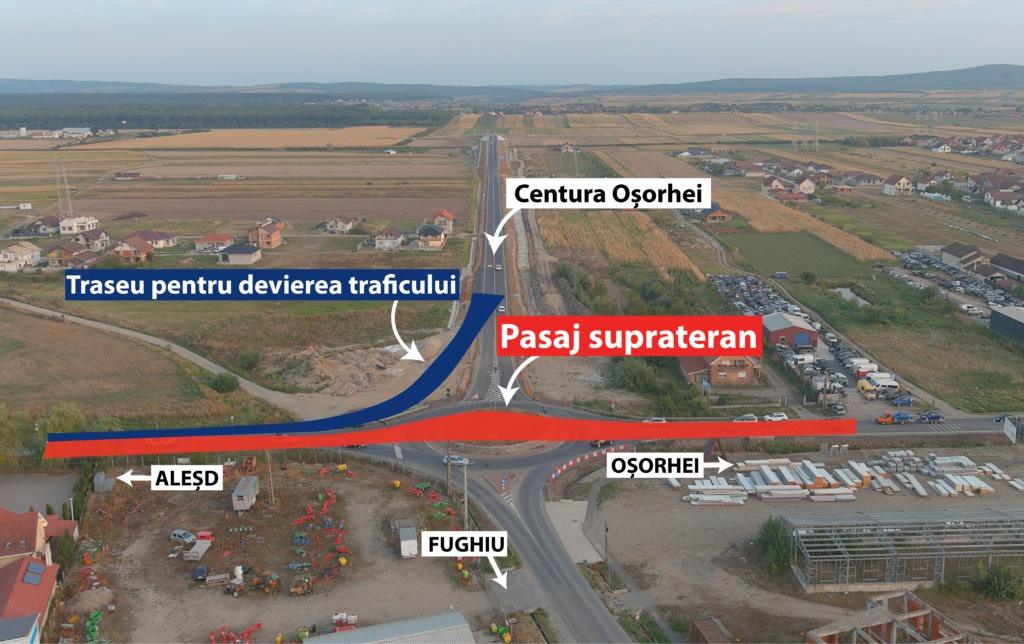 „Pentru a putea realiza lucrările într-un ritm susținut, vă reamintim că traficul rutier a fost deviat din sensul giratoriu pe o bretea special amenajată care leagă centura Oșorhei, prin viraj la dreapta, de DN 1, pe direcția spre Aleșd. Ordinul de începere a lucrărilor a fost emis pe 8 ianuarie. Între 8 ianuarie și 24 februarie a fost amenajată breteaua specială”, a mai precizat Mălan.