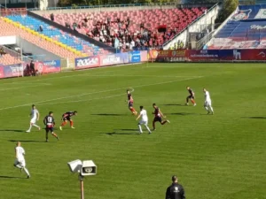 Prima repriză nu a oferit prea multe ocazii de poartă, dar s-a jucat aprig, roş-albaştrii luptându-se de la egal la egal cu liderul neînvins al campionatului.