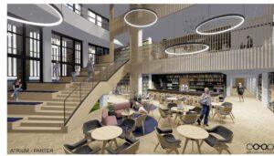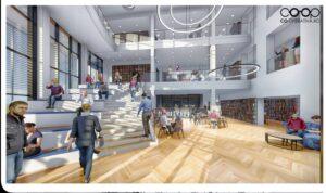 Parterul, cea mai mare încăpere, va dispunede o cafenea literară și o terasă exterioară. La etajul 1, spațiile vor fi reconfigurate pentru birouri administrative și spații de depozitare, un auditorium pentru adulți, săli de lectură, zone pentru training de competențe digitale și zone de expunere de cărți. La etajul 2 va fi amenajată o ieșire pe terasă, o sală de conferințe, o sală de lectură, mediatecă și un studio pentru înregistrări. Toate spațiile sunt adaptate pentru accesul persoanelor cu dizabilități. Totodată, vor fi montate 2 lifturi pentru a facilita accesul.