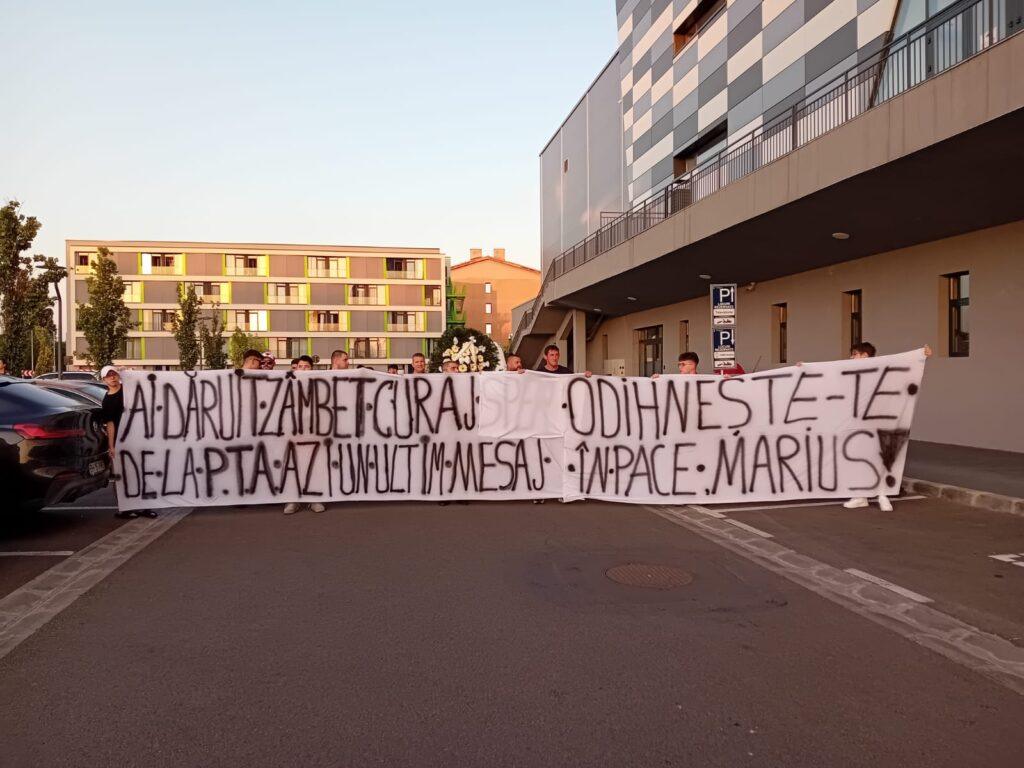 „Ai dăruit zâmbet, curaj, de la Peluza Toni Alexe un ultim mesaj”, „Odihnește-te în pace, Marius!” – se citește pe un banner ținut de suporteri. Printre lacrimi și îmbrățișări, comunitatea încearcă să găsească alinare în mijlocul unei pierderi care lasă urme adânci.