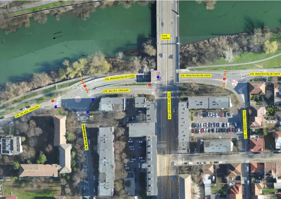 - Dinspre Splaiul Crișanei, circulația se va desfășura pe breteaua principală a străzii, spre Bulevardul Decebal.
