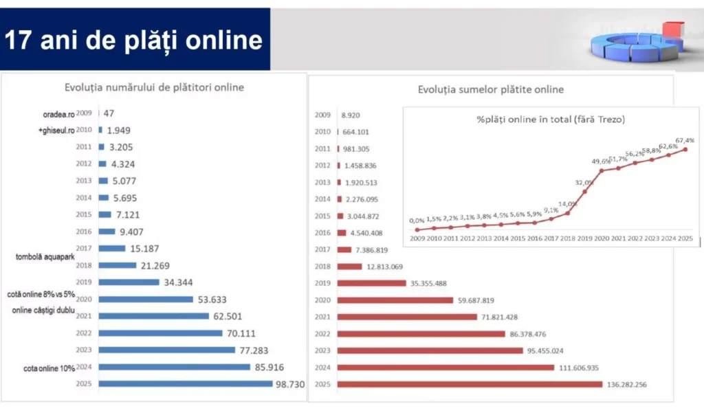 Creșterea spectaculoasă a plăților online — 22% ca valoare și 15% ca număr de contribuabili — arată că digitalizarea este tot mai bine adoptată, în ciuda dificultăților temporare generate de lucrările de modernizare a sediului Primăriei”, a mai arătat Direcția Economică.