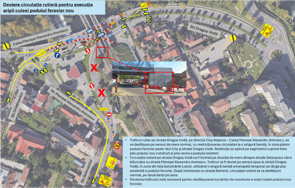 În perioada 18 octombrie – 18 noiembrie 2025, circulația va fi restricționată pe strada Dragoș Vodă și în zona podului feroviar peste Crișul Repede, pentru lucrările de construire a aripii culeei aferente podului. Lucrările sunt realizate de S.C. Webuild Pizzarotti, iar autoritățile îi roagă pe șoferi să respecte semnalizarea temporară instituită.