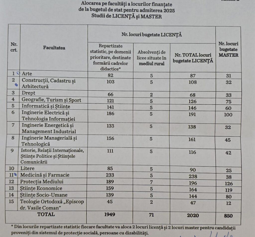 Universitatea din Oradea a alocat 2.020 de locuri bugetate pentru studii de licență și 850 de locuri bugetate pentru masterat, pentru sesiunea de admitere 2025. Repartizarea s-a făcut în funcție de cererea din anii anteriori, nevoile pieței muncii și prioritățile naționale privind formarea cadrelor didactice și incluziunea socială. Noutate: Învățământ dual în parteneriat cu agenți economici!