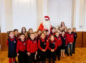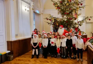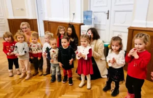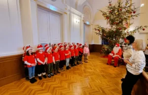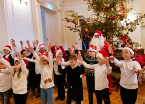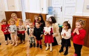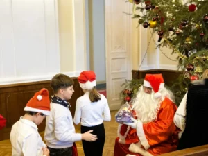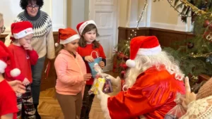 Moș Crăciun i-a întâmpinat pe copii în Sala Mare, lângă bradul împodobit, și le-a oferit cadouri, spre bucuria tuturor participanților.