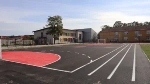Totodată, curtea școlii a fost amenajată prin asfaltare, amenajarea și trasarea terenului de sport, precum și echiparea acestuia cu echipamente sportive.