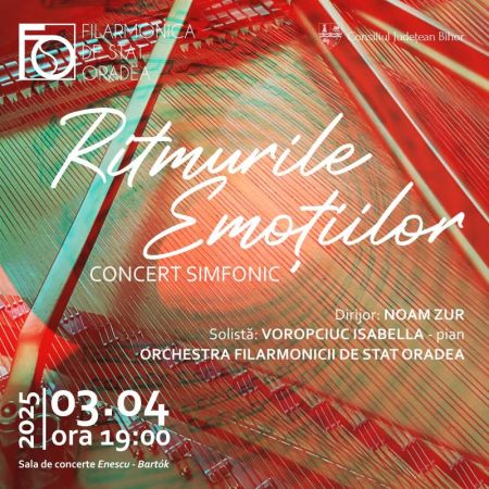 Filarmonica de Stat Oradea invită melomanii la un eveniment muzical de excepție, intitulat „Ritmurile Emoțiilor”. Acesta va avea loc joi, 3 aprilie, la ora 19:00, în sala de concerte „Enescu – Bartók”. Concertul va fi dirijat de celebrul dirijor israelian Noam Zur și o va avea ca solistă pe talentata pianistă Voropciuc Isabella.