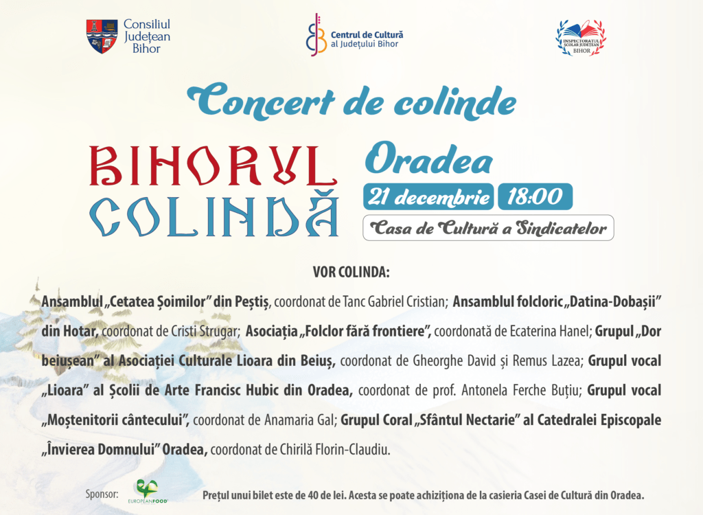 Începând de miercuri, 10 decembrie 2025, iubitorii tradițiilor bihorene își pot achiziționa biletele pentru concertul extraordinar „Bihorul Colindă”, ediția a IV-a. Evenimentul va avea loc duminică, 21 decembrie, de la ora 18:00, la Casa de Cultură a Sindicatelor din Oradea. Biletele sunt disponibile la casieria instituției, la prețul de 40 de lei.