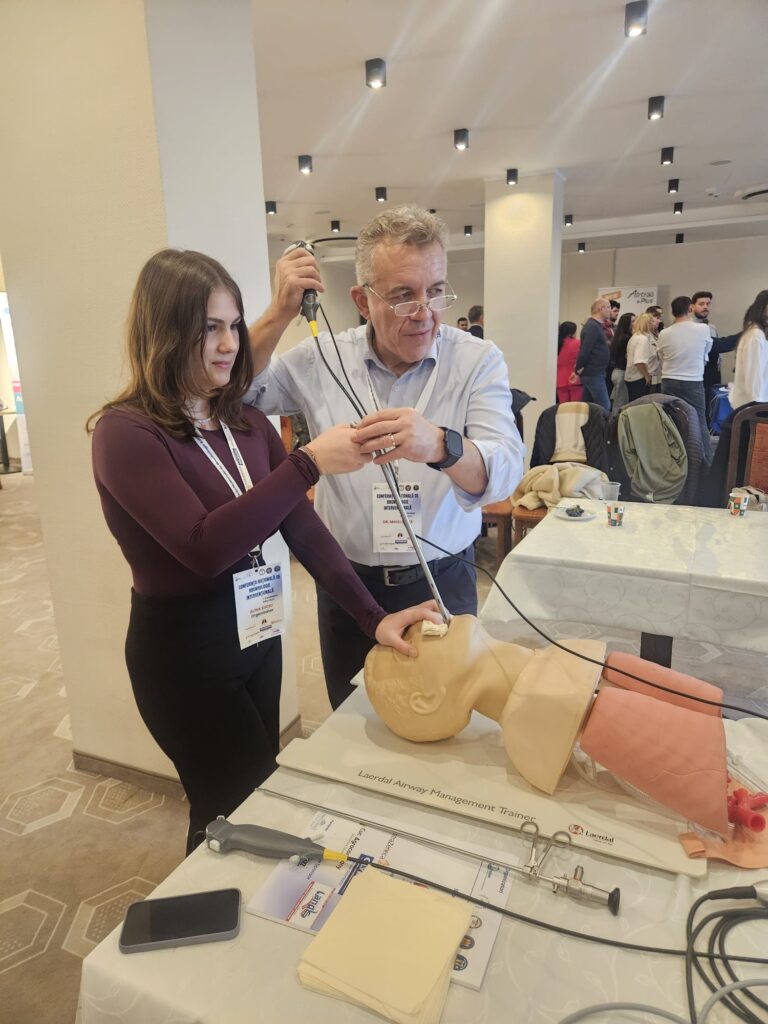 A doua zi a fost dedicată exercițiilor hands-on. Participanții au lucrat pe simulatoare și au exersat manevre esențiale din bronhologia intervențională: EBUS-TBNA, ventilația cu jet, montarea stenturilor traheale, extracția de corp străin, oprirea sângerărilor, bronhoscopia în urgențe și în ATI.