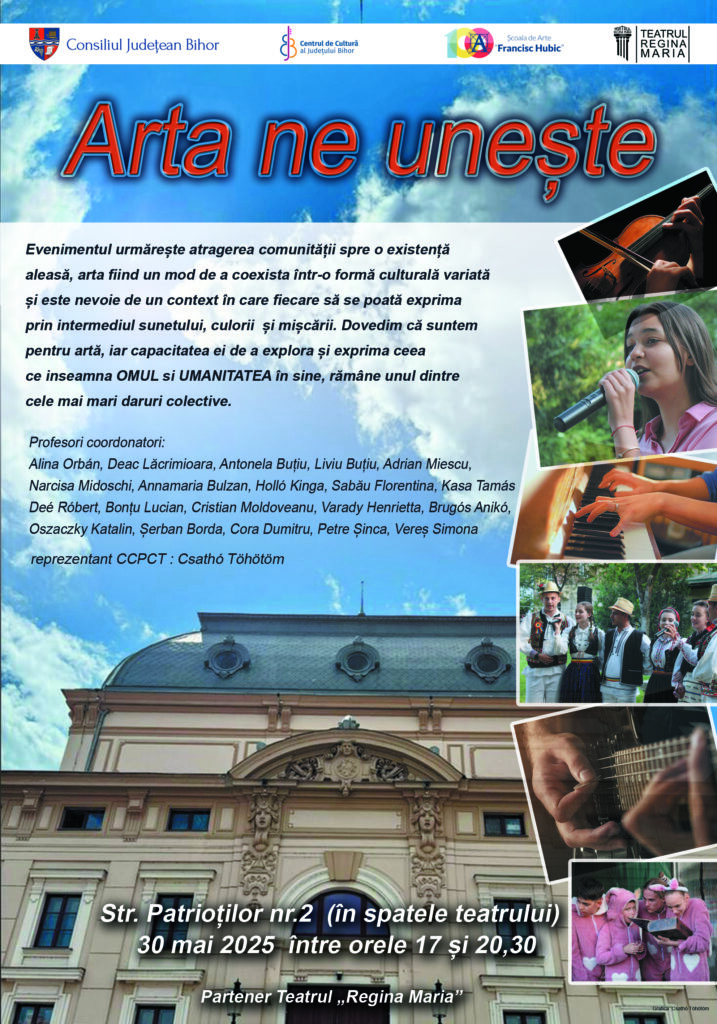 Centrul de Cultură al Județului Bihor, prin Școala de Arte „Francisc Hubic”, organizează vineri, 30 mai, între orele 17:00 și 20:30, spectacolul „Arta ne unește”. Acesta se va desfășura în aer liber, pe strada Patrioților nr. 2 (în spatele Teatrului „Regina Maria”).