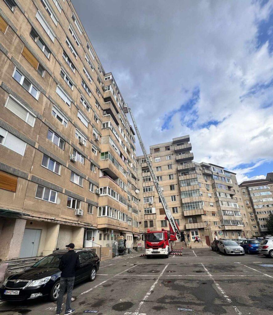 La Oradea, pompierii Detașamentului 1 Oradea au intervenit cu o autospecială de lucru la înălțime pentru îndepărtarea unor bucăți de tencuială desprinse parțial de pe fațada unui bloc cu 10 etaje, situat pe strada Transilvaniei, care reprezentau un pericol pentru siguranța pietonilor.
