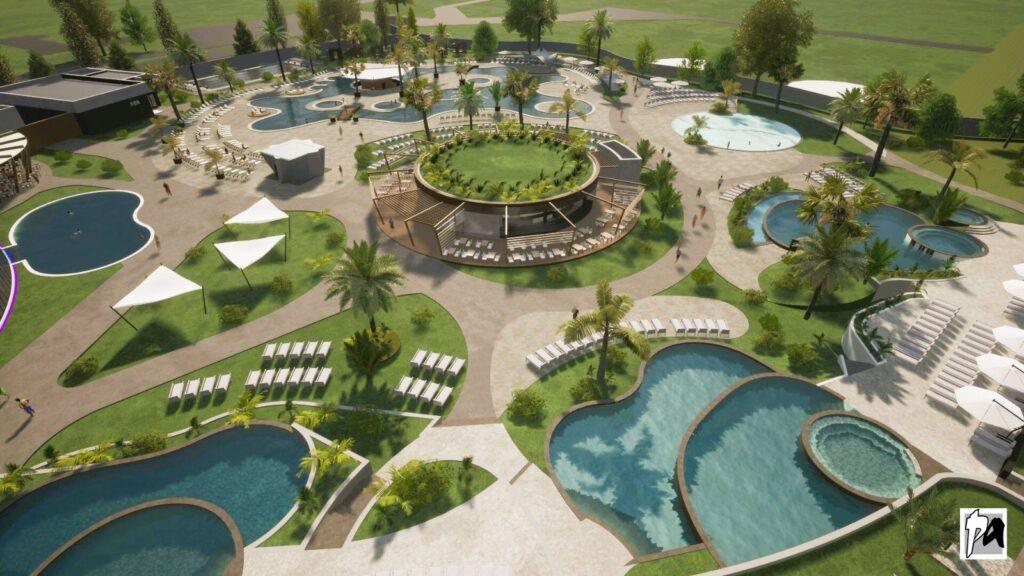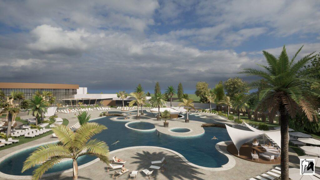 – Centru SPA care va funcționa înclădirea principală, cu regim de înălțime subsol+parter+etaj parțial, cu o suprafață desfășurată de 8.853 mp, care va include un ansamblu de bazine interioare (peste 500 mp de luciu de apă), zona de spa, filtre personal și public, vestiare, spații tehnice, alimentație publică, zona de birouri, foaiere, o sală fitness.