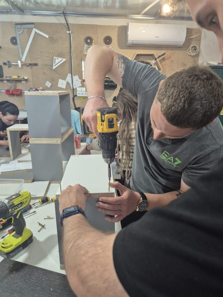 Atelierul interactiv s-a desfășurat la „Dreian Concept”, o companie locală. Andrei Dejeu, fondatorul acestei afaceri de succes în domeniul mobilierului personalizat, i-a provocat pe oaspeții săi să proiecteze și, mai apoi, să realizeze efectiv câte o mică etajeră.