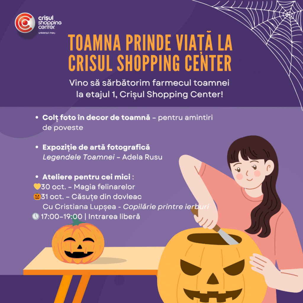 Toamna își face simțită prezența la Crișul Shopping Center, care îi dedică un decor plin de culoare și activități pentru toate vârstele. Vizitatorii sunt invitați la etajul 1 al centrului comercial să descopere farmecul anotimpului într-o atmosferă caldă și inspirantă.
